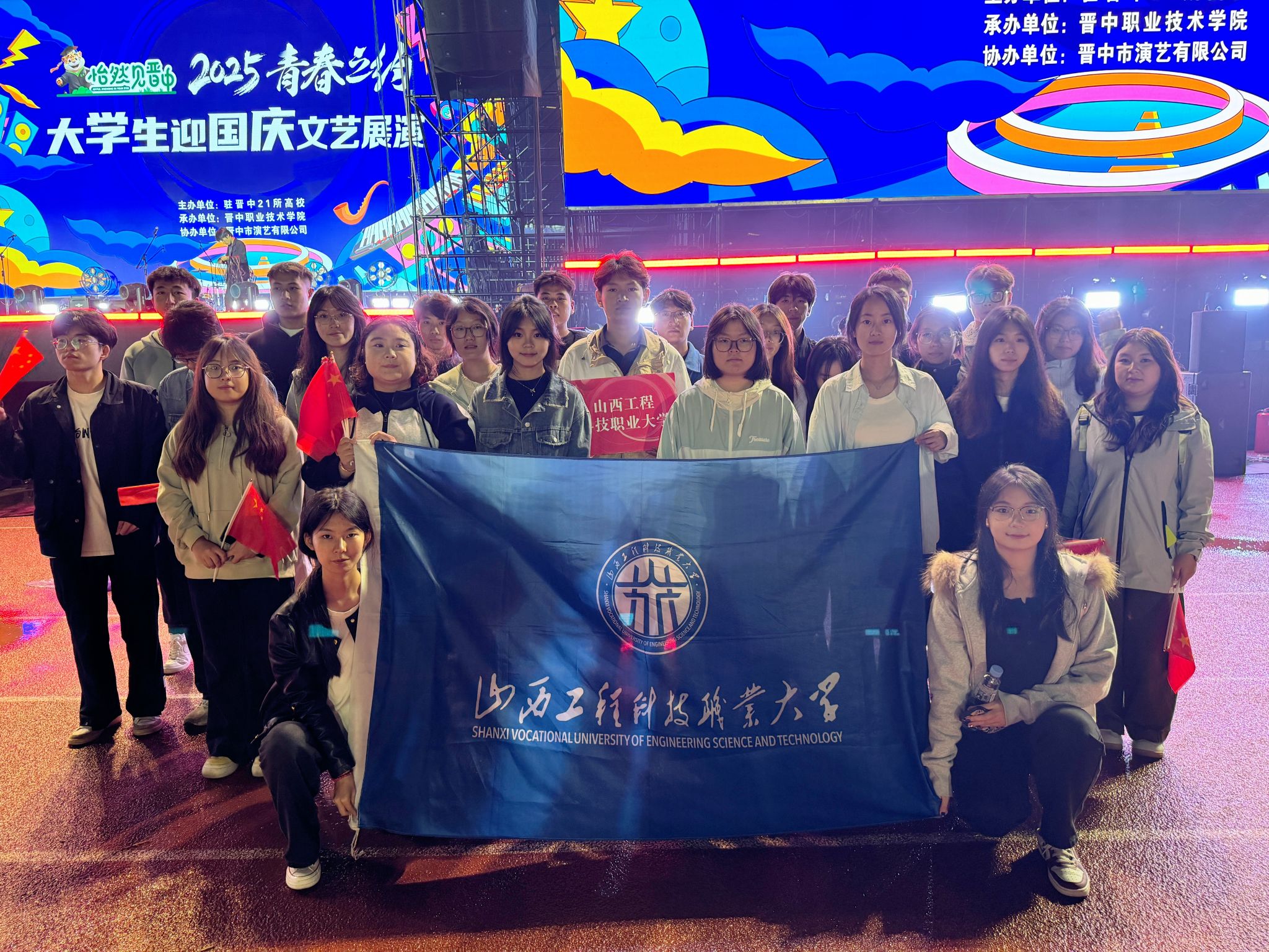 9月27日,晋中市2025“青春之约”大学生迎国庆文艺展演活动在晋中职业技术学院隆重举行。来自晋中21所高校的师生齐聚一堂,我校28名学子怀揣着热忱奔赴现场,为活动的圆满成功添砖加瓦。