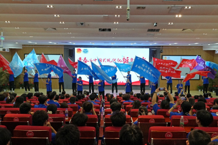 仪式上,21支团队代表高举旗帜登台,齐声高喊“青春为中国式现代化挺膺担当”口号,旗帜在会场上空挥舞,象征责任与使命的精神火炬完成传递,铿锵宣言层层递进,将“强国有我”的青春信念融入旗帜律动,现场掌声雷动,以极具仪式感的形式将出征仪式推向高潮。