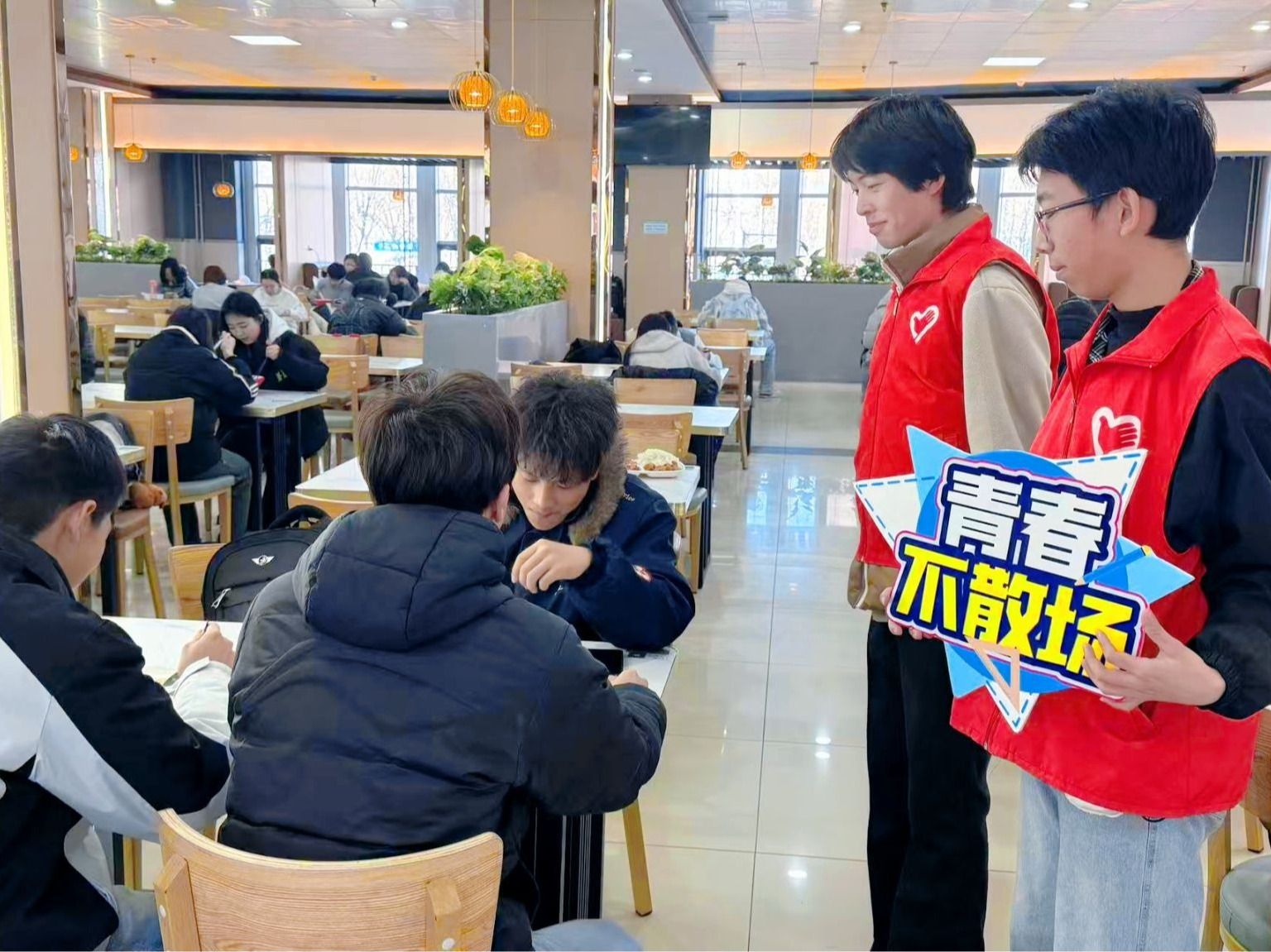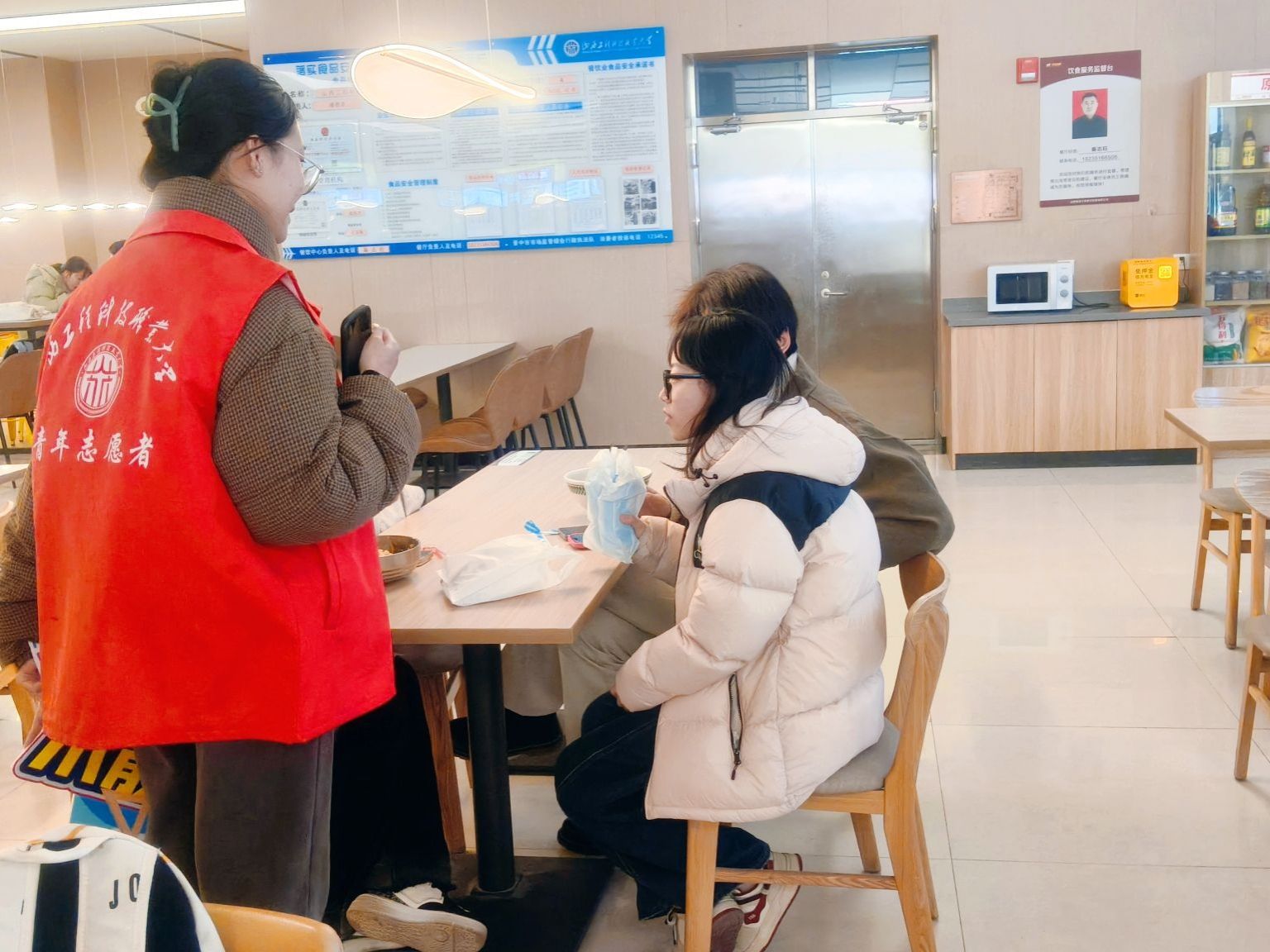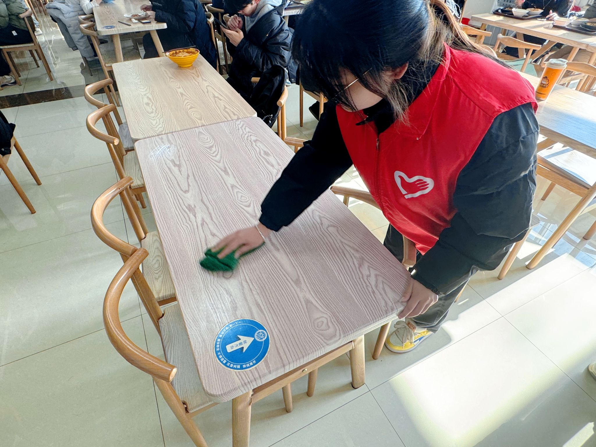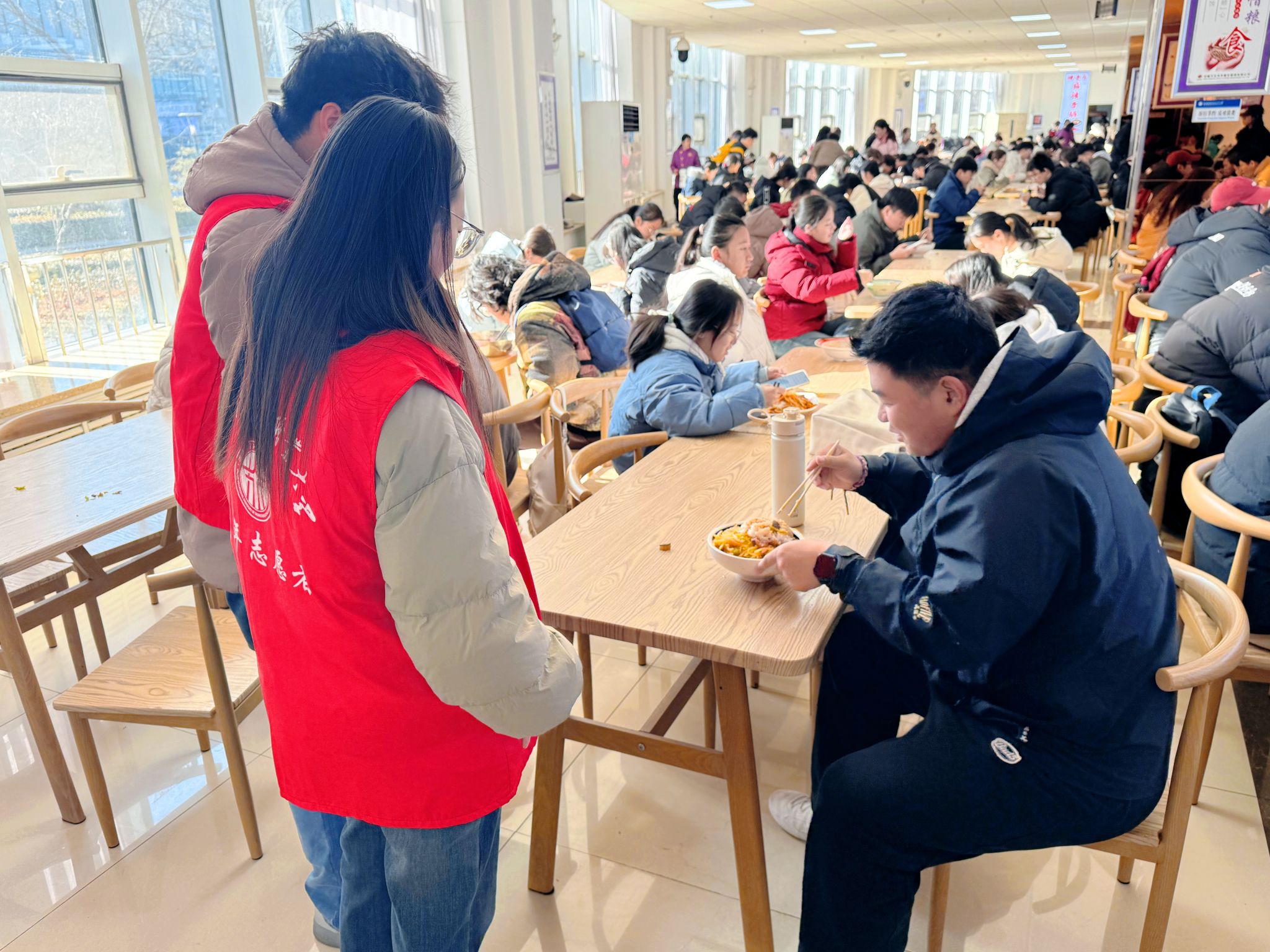 按照“定点定岗、责任到人”的原则,雅园、和园、德韵轩、麦道四个食堂的责任区域明确划分,每个点位都对应具体的服务职责与范围。志愿者们身着志愿服、手持引导牌,在食堂的用餐区、收盘区等重点区域集合。互动交流、提醒“光盘”、清理桌面,分工协作默契十足。尽管用餐高峰人流密集、任务繁重,大家却服务热情、态度亲和,充分发扬“服务他人、提升自我”的志愿理念,以“不怕脏、不怕累、不怕烦”的劲头坚守岗位。连续服务数小时,原本忙碌杂乱的食堂逐渐变得井然有序,现场洋溢着温馨和谐的文明氛围。