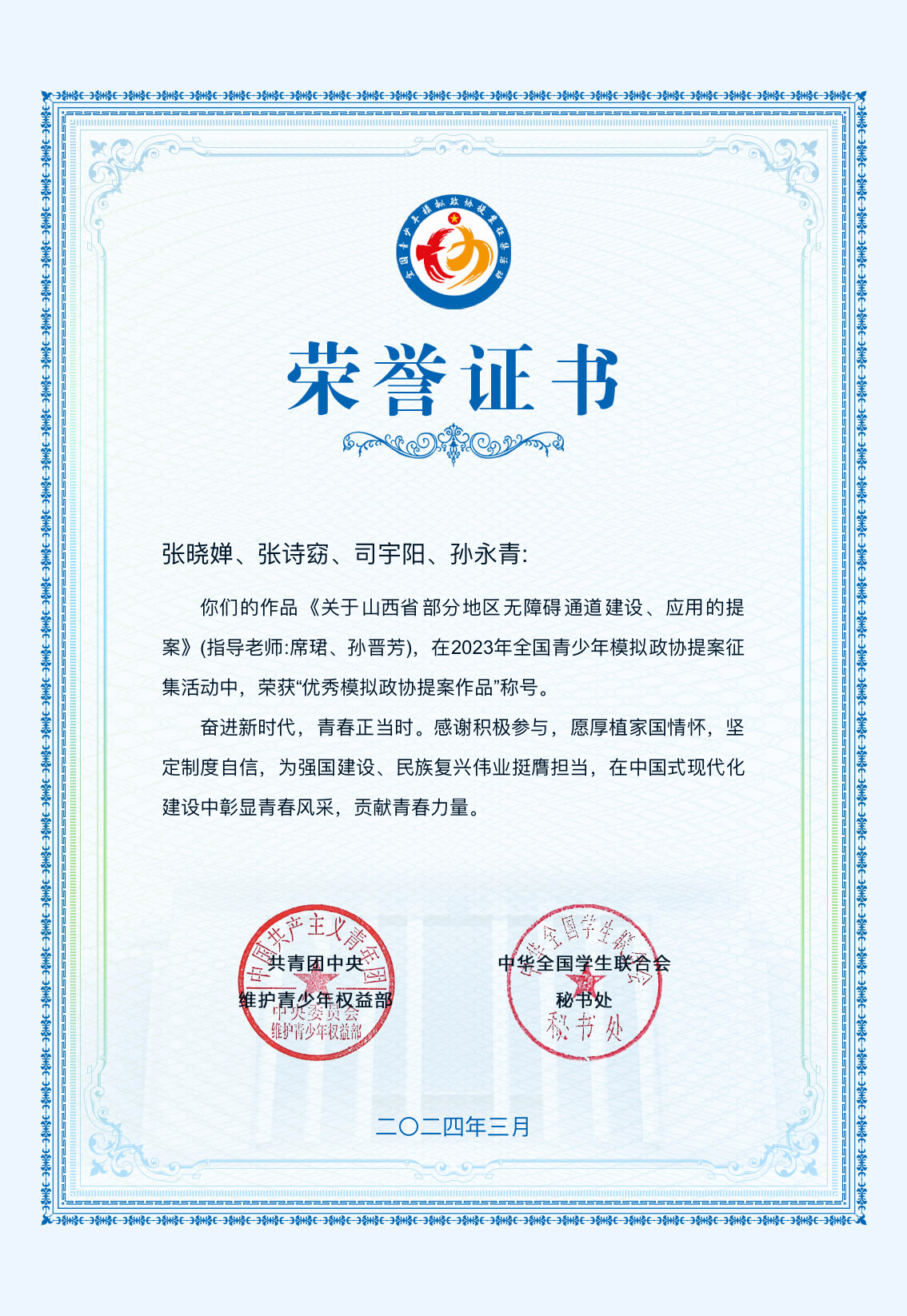 踔厉奋发勤耕耘,不负韶华创佳绩。近期,2023年全国青少年模拟政协提案征集活动经过申报、评审、公示等环节,最终结果于2024年4月正式公布。经校团委推荐,我校文法学院张晓婵、张诗窈、司宇阳、孙永青四位同学提交的作品《关于山西省部分地区无障碍通道建设、应用的提案》,获得“优秀模拟政协提案作品”荣誉。