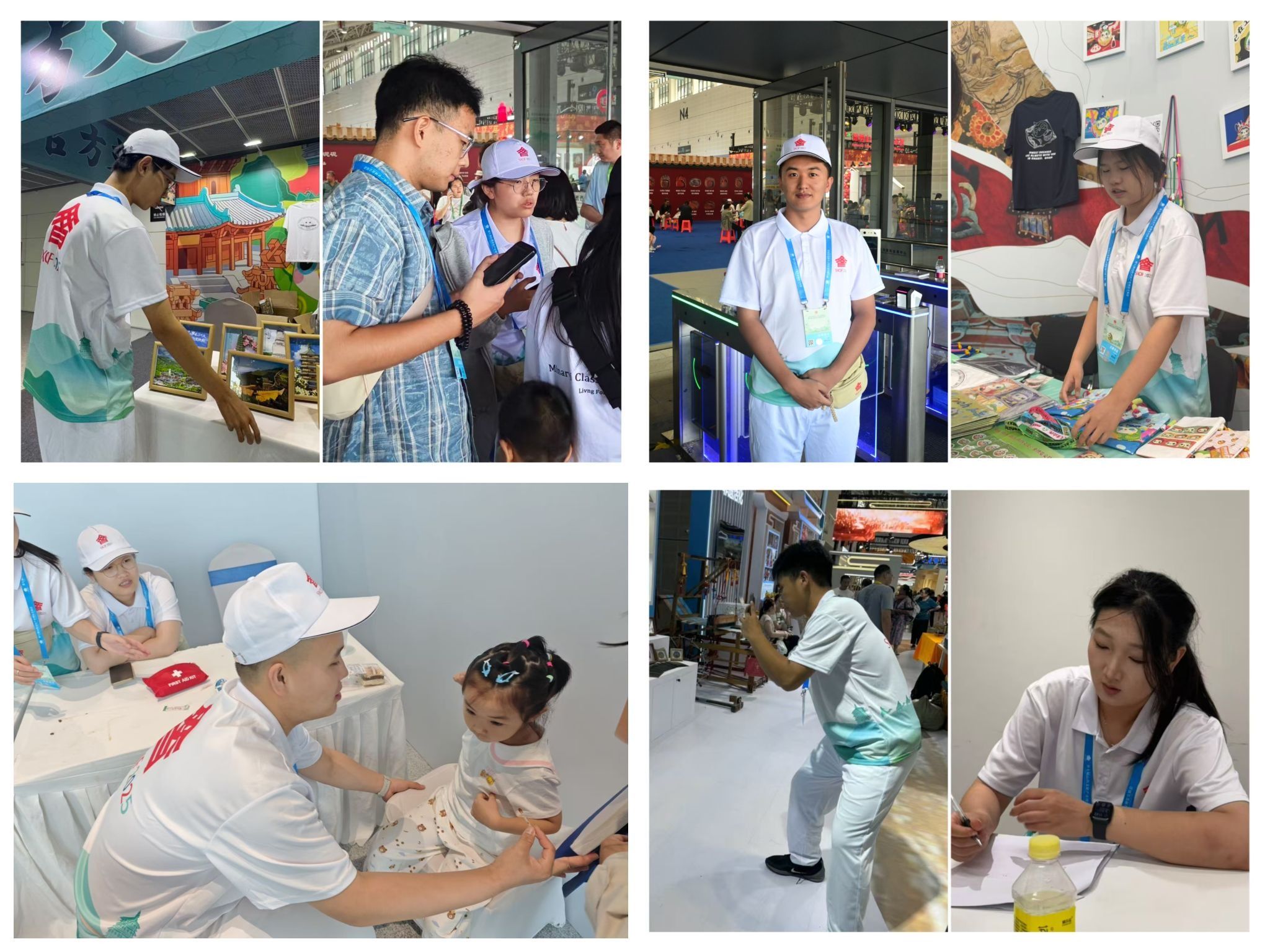 展会服务检票口区,汽车工程学院汽服2201B班的田溯源、汽服2304D班的韩东波、计算机工程学院智交2402B班的赵紫如、工程管理学院造价2406Z班宋畅、造价2303B班的韩秉龙5名志愿者在展会多个检票口处进行票务核对及指引路线工作。志愿者主动为不会操作智能手机的老人进行细致入微的帮助,老人称赞他们“有担当、效率高,展现了当代大学生的优秀品质”。