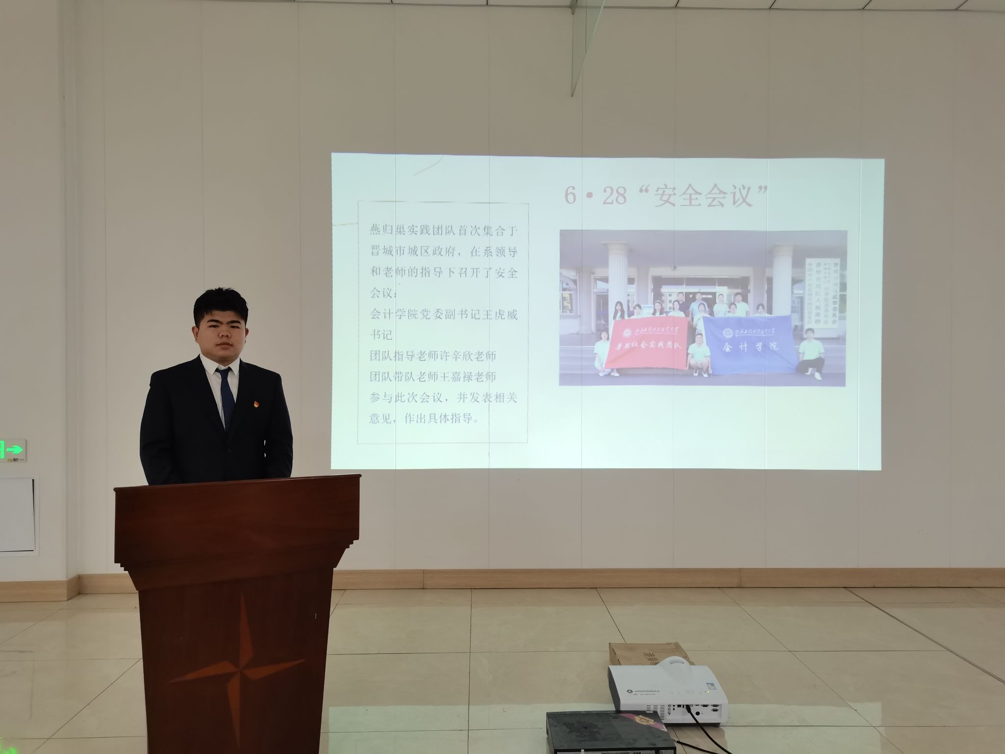 荣获全国三下乡优秀团队的文法学院“同心振乡”实践团队代表,让大家欣赏了他们的《变迁》纪录片,让在场的同学跟着镜头体会了团队的每一次实践内容,视频的内容使得在场同学无一不称赞;荣获山西省暑期三下乡优秀个人的信息工程学院张李婉同学,带着大家重温对盐湖区红色文化旅游景点进行的实地参观调研情况,让在场同学更直观的感受山西古朴厚重的文化底蕴;校团委红色记忆寻访实践团队充分发挥红色资源优势,带领在场同学重温八路军太行纪念馆、八路军总部王家峪旧址等地,在铭记党的历史,传承伟大太行精神的同时,带领同学们在“行走的课堂”中研有所思、学有所获;文法学院“同心振乡”实践团队”代表让大家欣赏了他们的《变迁》纪录片让在场的同学无一不称赞;会计学院燕归巢兴晋实践团队代表讲述了他们与黄城社区联手创建了“山西工程科技职业大学会计学院大学生社会实践基地”,并成功挂牌的实践情况;汽车工程学院“匠心筑梦”暑期实践团队代表分享着他们在实践中领悟到青年学生应培养一颗工匠之“心”,精心打磨每一个零部件,练就过硬的本领,成就精彩人生的实践过程......