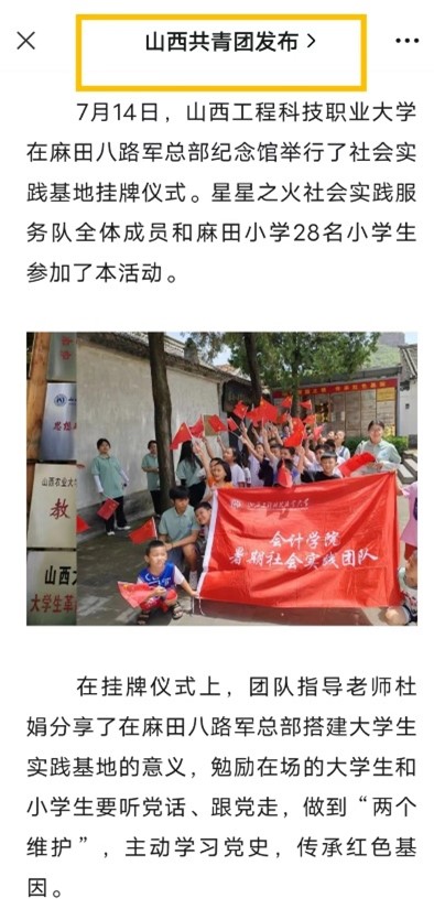 扬帆起航正当时,砥砺前行铸辉煌。7月18日,会计学院结束了为期八天的社会实践活动。社会实践团队来到左权县麻田镇,开展红色课堂进行讲诵红色故事、唱红歌、看红色电影、参观红色基地、寻访老党员等活动。多次参观八路军总部纪念馆,走进老党员家聆听抗战史,组织学习团十九大精神和《习近平与大学生朋友们》一书,深刻领悟领袖对青年的期许,将党史学习与社会实践充分结合。在麻田中心小学为28名左权娃进行为期一周的看护志愿服务。开展趣味体育、科学实验、奇妙手工、围棋、唱歌、手势舞等素质拓展训练课堂;举行假期防溺水、防诈骗、居家安全等安全知识讲座。实践队员每天7个小时的陪伴,解决了假期儿童“看管难”、生活劳动“实践少”、兴趣爱好“不广泛”等问题。实践团队志愿服务活动受到当地政府和家长的一致好评,