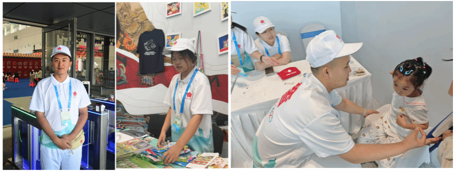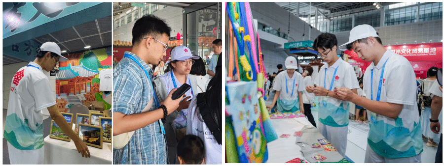 文化创意展示区,建筑设计学院古建2402B班的王宇欣和交通工程学院市政2301B班的黄家荣2名志愿者承担“文化讲解员助理”角色。他们提前熟悉展区内特色文创展品信息,反复演练讲解词,面对不同年龄、不同身份的观众,他们灵活调整讲解方式介绍每件展品背后的文化故事。累计为超过两万名观众提供讲解服务,多次获得观众与参展商的称赞。