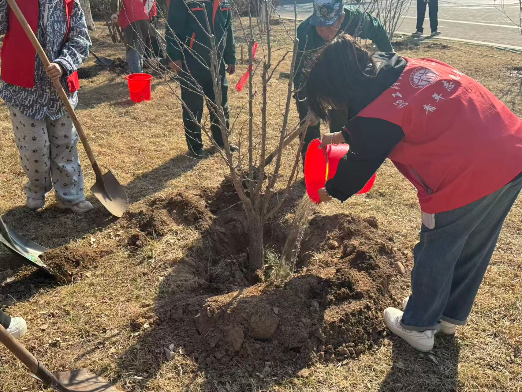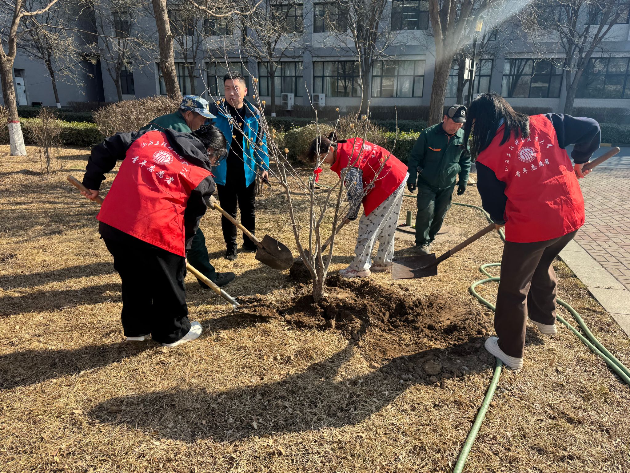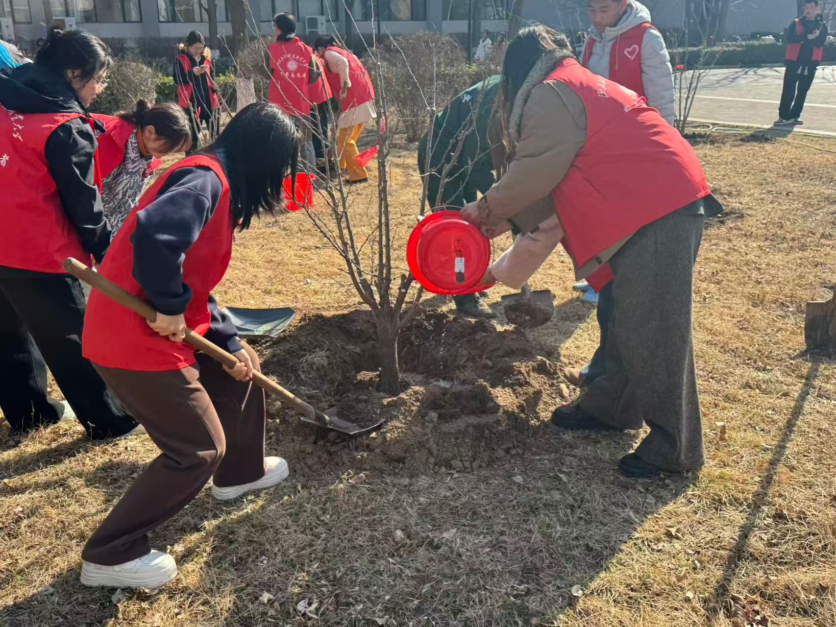 活动现场春意盎然、干劲十足。志愿者们分工协作、默契配合,挥锹挖坑、扶苗对齐、填土压实、提桶浇水,每一道工序都认真细致。在园艺师傅指导下,大家严格按照标准栽种,确保树苗成活生长。汗水与春光相映,校园里一派热火朝天的景象。
