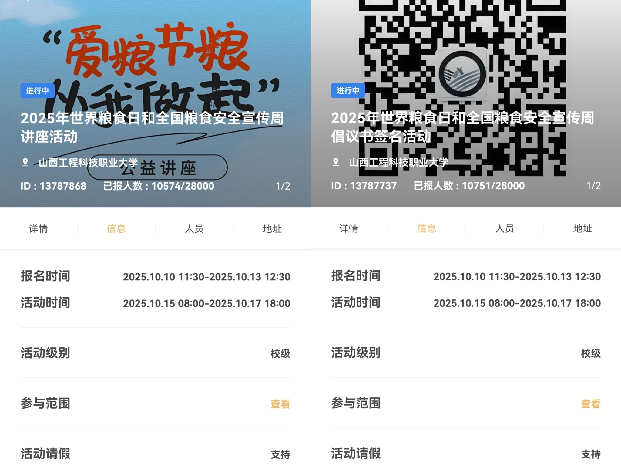按照山西省粮食和物资储备局、山西省农业农村厅、山西省教育厅、山西省邮政管理局、共青团山西省委员会、山西省妇女联合会,联合下发的《关于开展2025年世界粮食日和全国粮食安全宣传周活动的通知》安排,校团委积极组织、广泛动员,引导全校学生开展“爱粮节粮 从我做起”公益讲座和“倡议书签名”两项活动,进一步提升学生节粮爱粮的意识,共同营造浓厚的校园文化氛围。