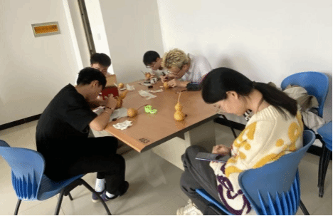 交流时,韩霞老师拿起一个烙有繁复花纹的葫芦说:“烙画最考验‘火候’和‘手劲’,心浮气躁就做不好,有时候一个复杂的图案需要连续工作十几个小时,烫伤手是家常便饭。但当你看到冰冷的葫芦被赋予生命和故事,一切辛苦都值得了。”同学们听后深受启发,一位学习产品设计的同学分享道:“韩老师的作品让我明白,好的设计是‘活’的,它承载着匠人的情感与实践”。我们未来做设计,不应该只追求视觉效果,更要思考如何为产品注入灵魂和文化底蕴。